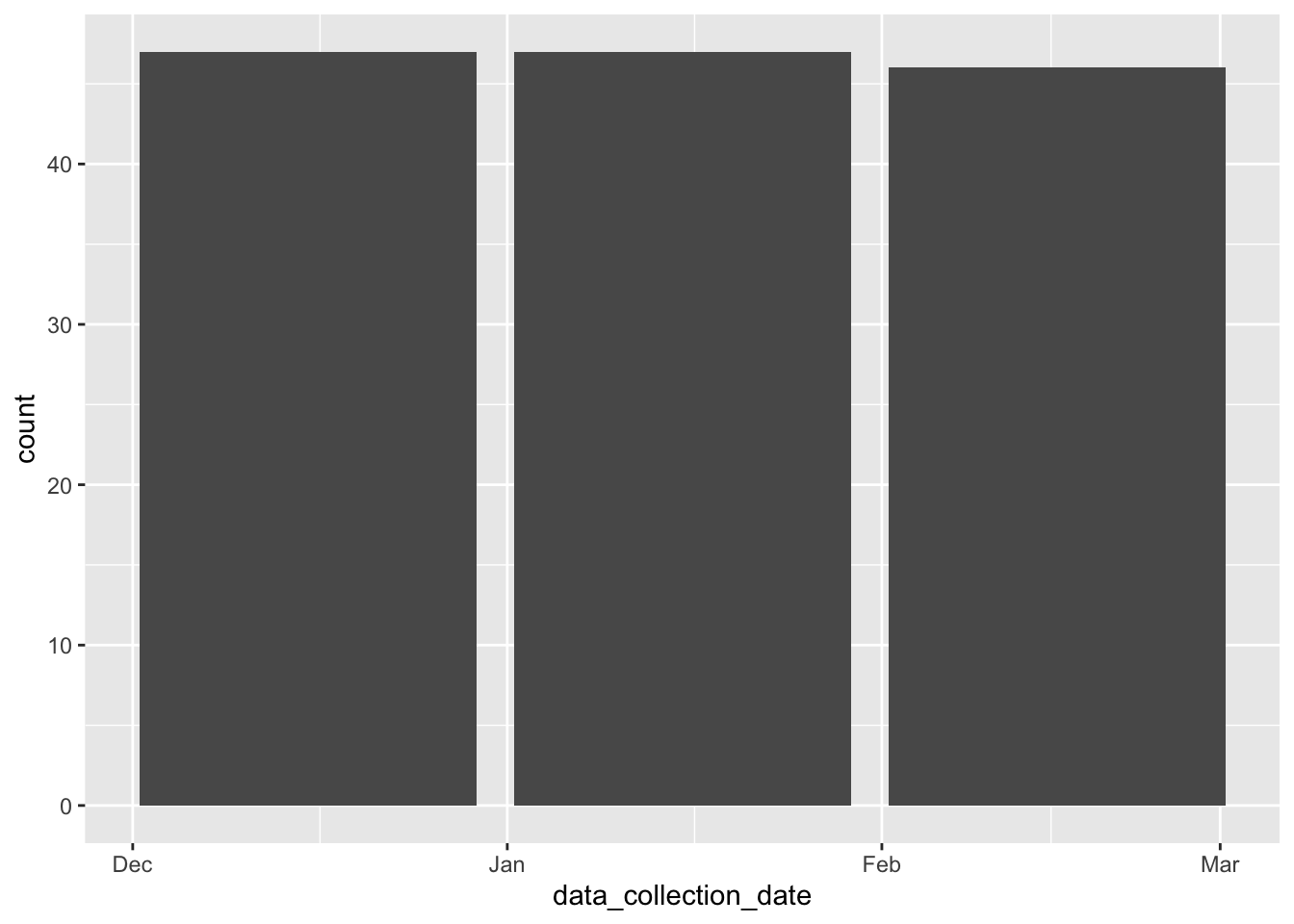 #Adding collection dates to the dataframen <-140date_vec <-rep(dates, length.out = n)date_vec <-sample(date_vec) # shuffle so dates aren’t in blockssynthetic$data_collection_date <- date_vecggplot(synthetic, aes(x = data_collection_date))+geom_bar()