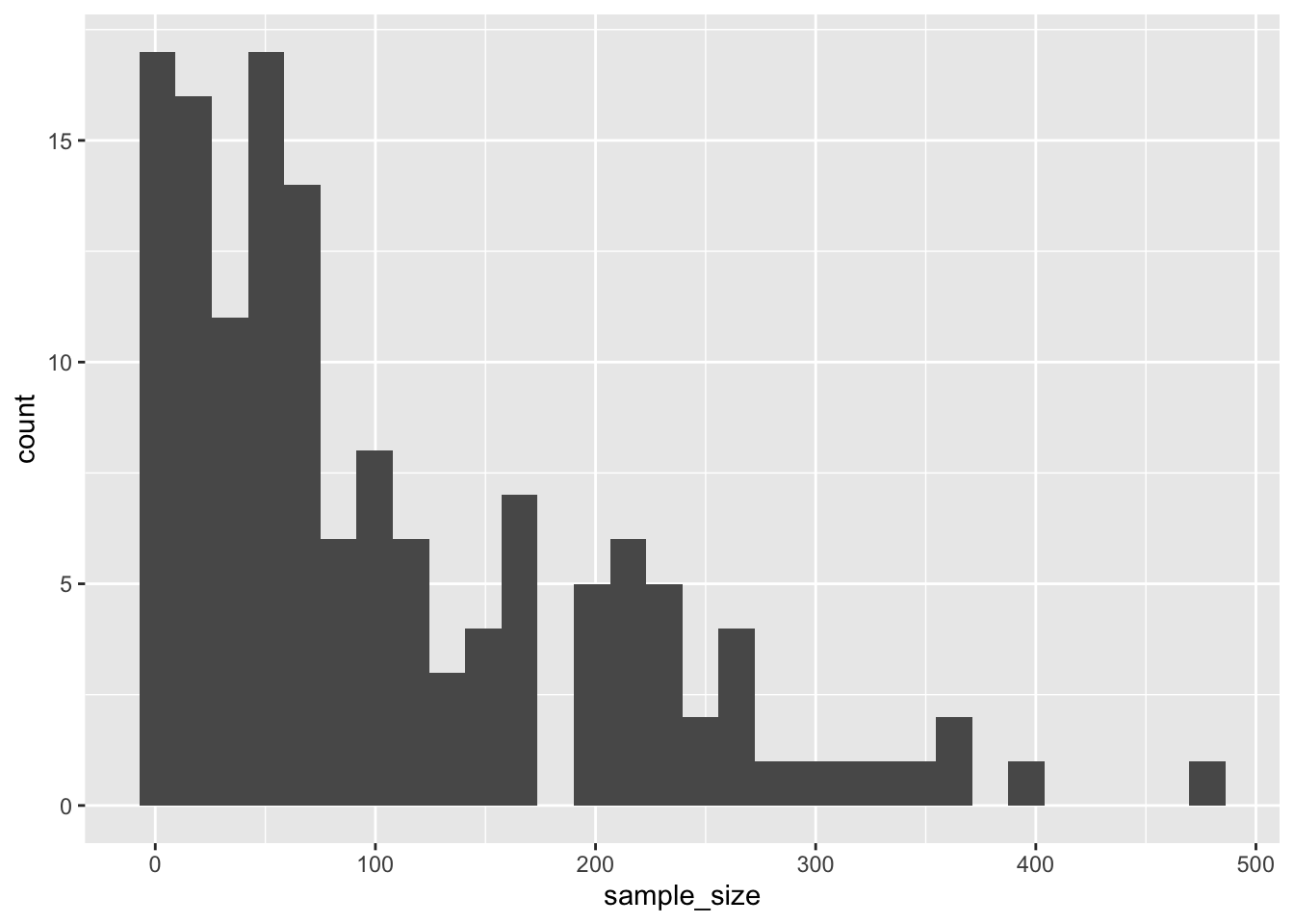 #Adding sample sizes to the data frameraw_n <-rexp(n, rate =1/120) # exponential; mean ~120 (lots of small values)sample_size <-pmin(pmax(round(raw_n), 1), 1000)synthetic$sample_size <- sample_sizeggplot(synthetic, aes(x = sample_size))+geom_histogram()