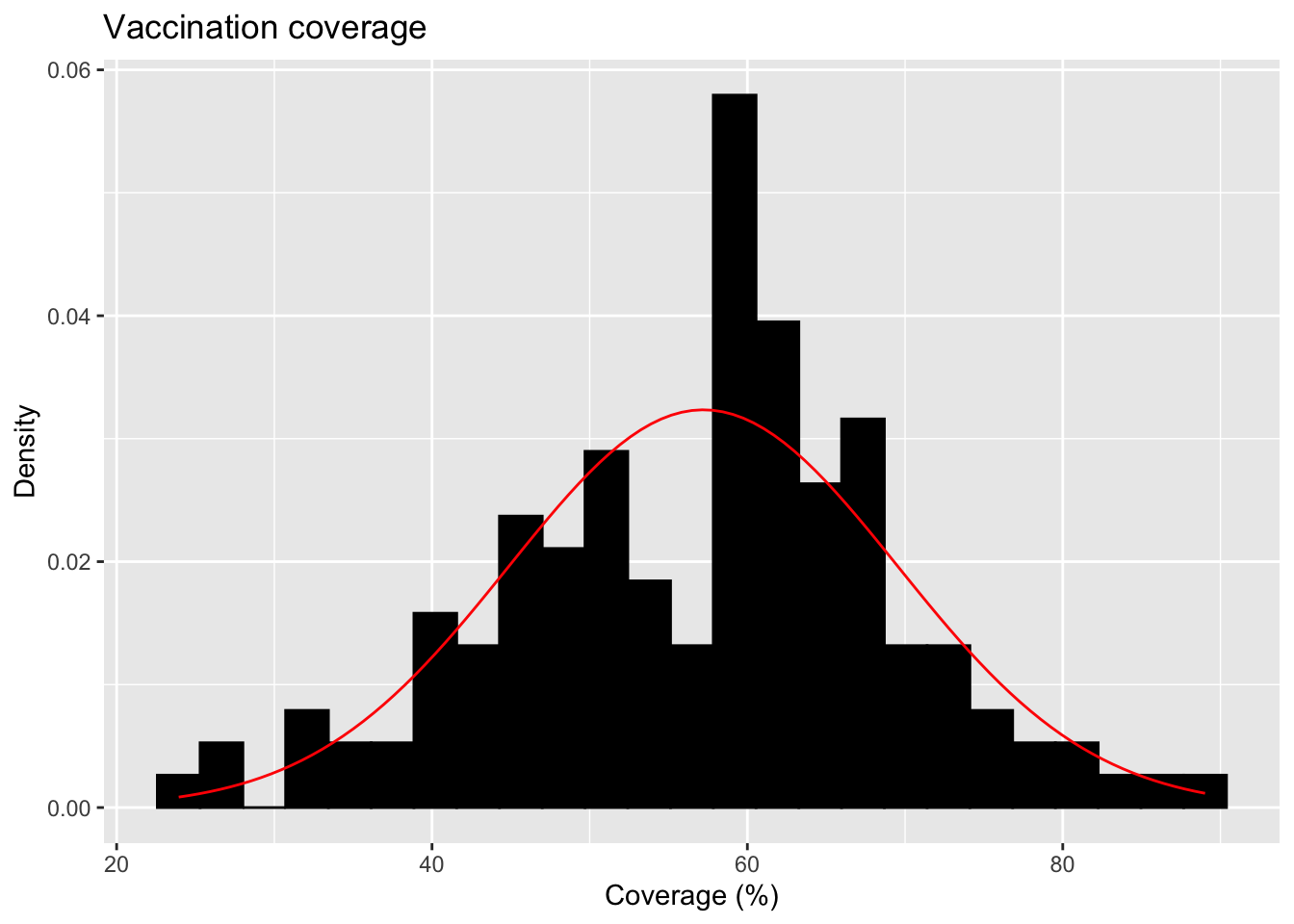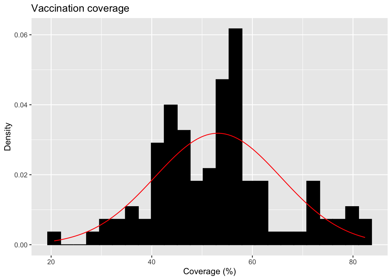 For the continuous variable of vaccination coverage, I will plot a distribution and calculate the mean and SD of this dataset.