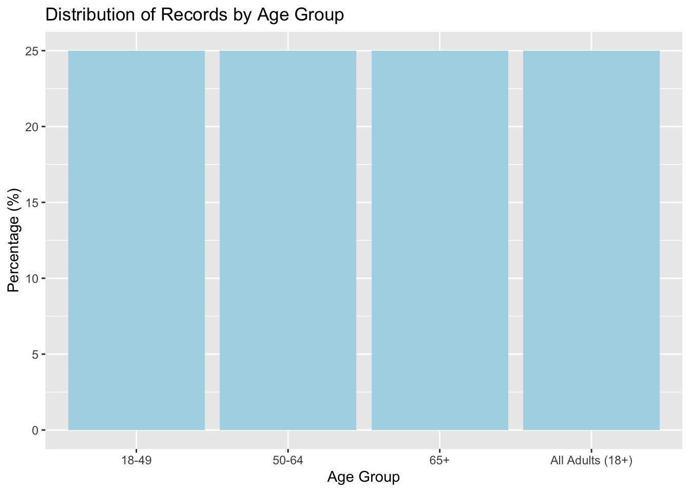 #Bar plot showing the percentage for each age groupggplot(age_summary, aes(x =reorder(Age_Group, -percent), y = percent)) +geom_col(fill ="lightblue") +labs(title ="Distribution of Records by Age Group", x ="Age Group", y ="Percentage (%)" )