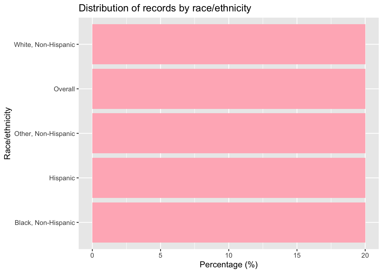 At this point, the dataframe now has both races and age groups. Because of how they’re made, we’ve made sure that they’re equally distributed - just like in the cleaned dataset above.