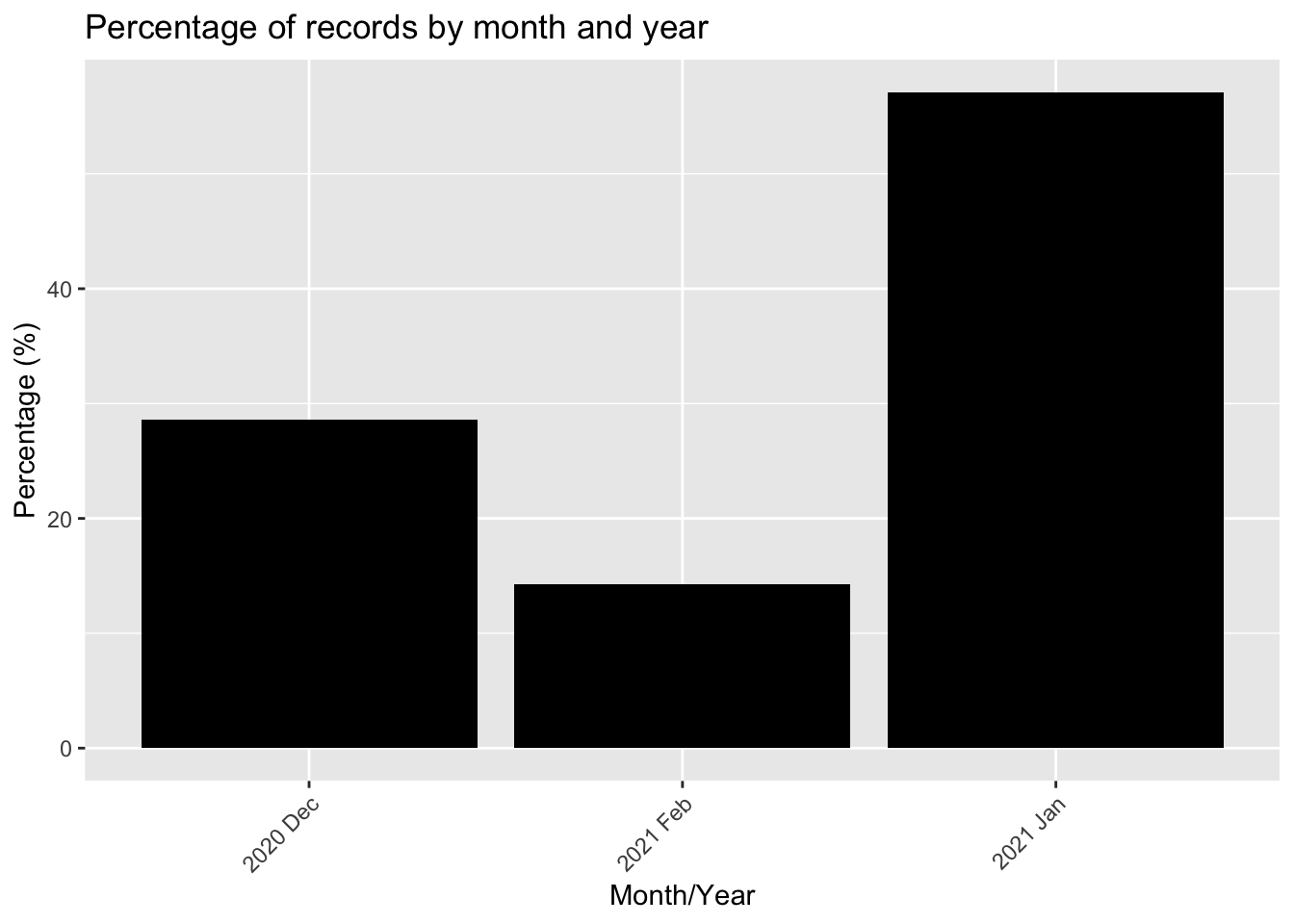 # Bar plot showing percentage of records per monthggplot(date_counts, aes(x = Data_Collection_Midpoint_date, y = percent)) +geom_col(fill ="black") +labs(title ="Percentage of records by month and year",x ="Month/Year",y ="Percentage (%)" ) +theme(axis.text.x =element_text(angle =45, hjust =1))