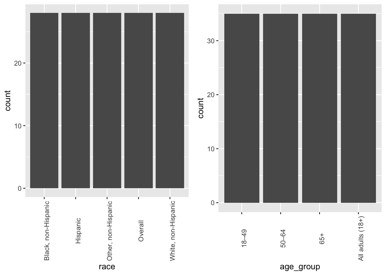 #Creating a summary table for Race_Ethnicity:#calculates how many records fall under each racial/ethnic group and what % that israce_summary <- flu_trimmed %>%group_by(Race_Ethnicity) %>%summarise(count =n() #Count the number of records (rows) in each group ) %>%mutate(percent =round(100* count /sum(count), 1) #Calculate what % of the total each group represents )race_summary